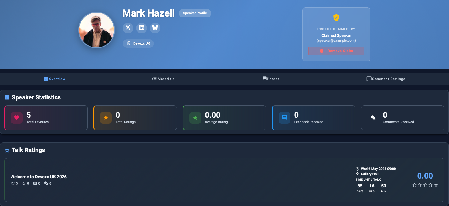 Once your speaker claim is successful, you’ll see your personal speaker profile page.