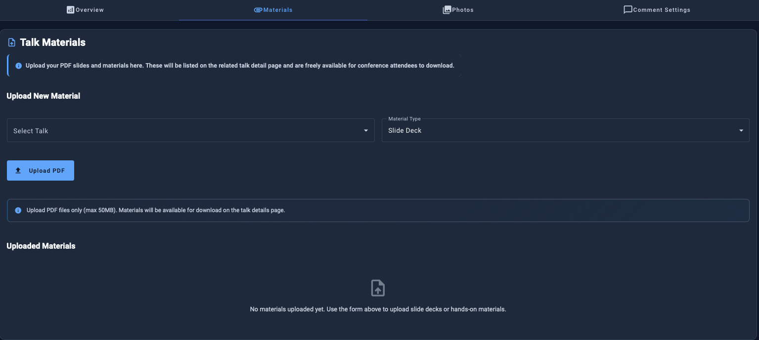 After your talk, you can upload your slide deck in PDF format. A download link will then appear on the related talk detail page for authenticated users.