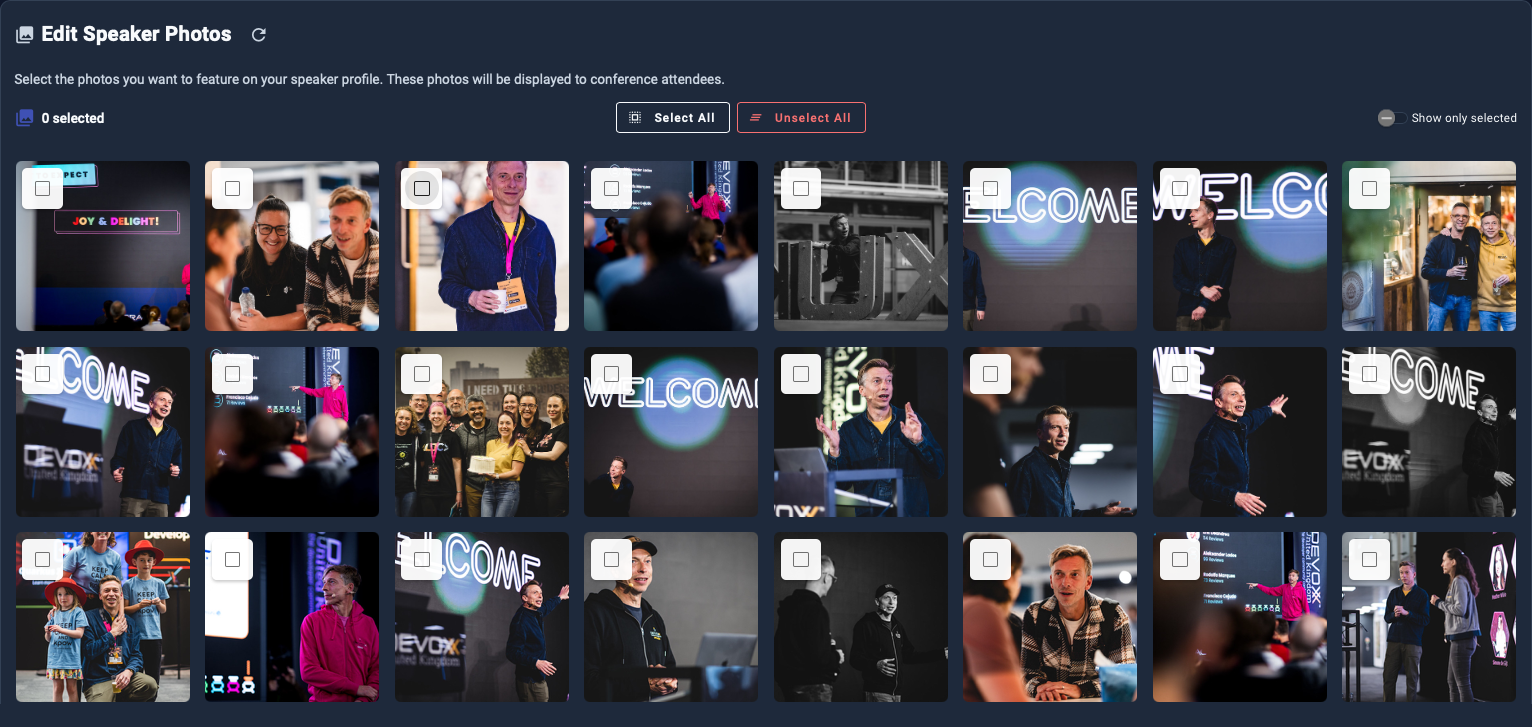 If have speaker photos from previous Devoxx or VoxxedDays editions, this page lets you select or unselect which ones appear on your speaker profile. Since false positives can occasionally occur, you can also edit or remove photos here.